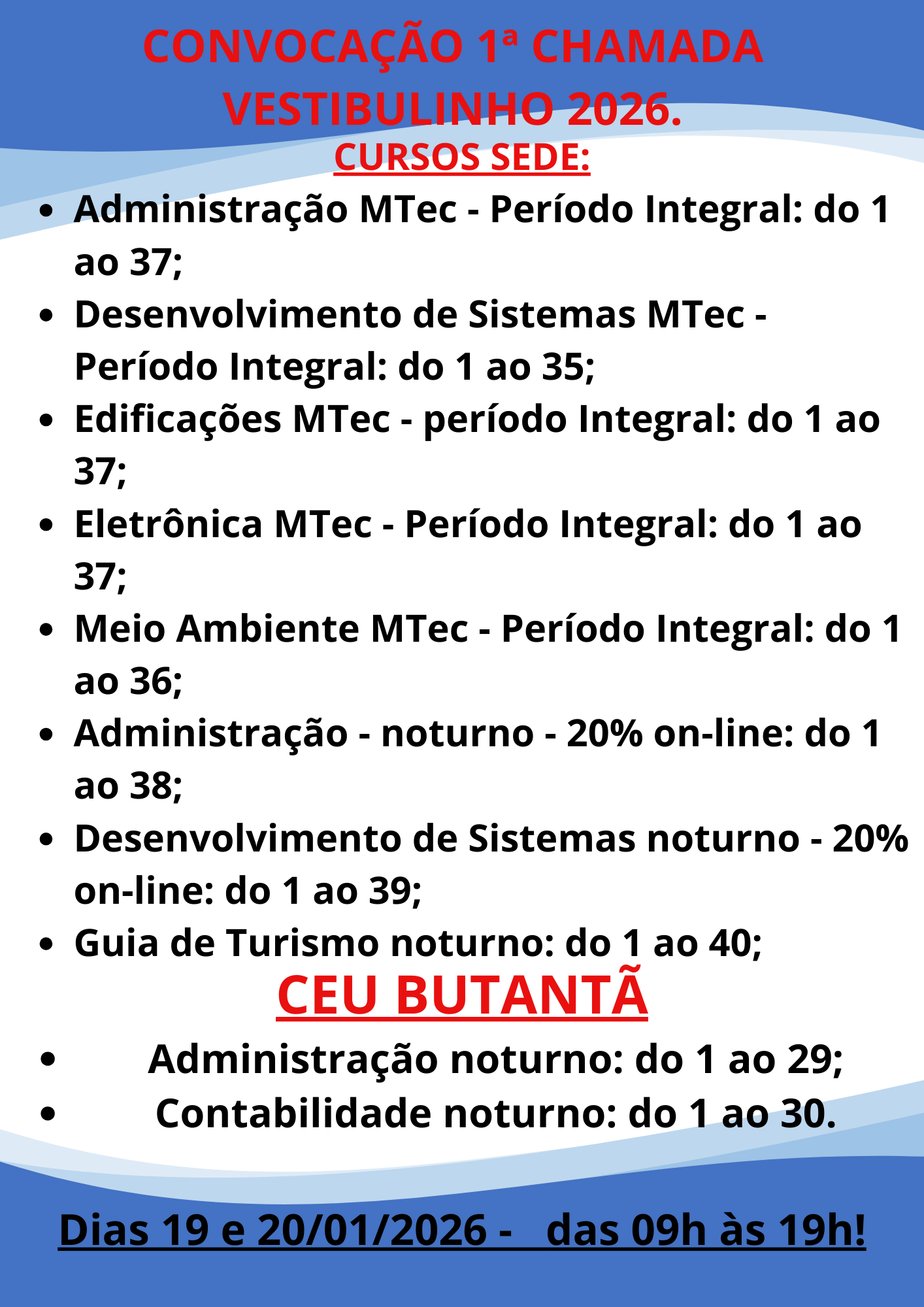 CURSOS SEDE: CURSOS CEU BUTANTÃ Dias: 19 e 20/01/2026 – das 09h às 19h! Prepare sua documentção, e não perca as datas e horários. Lembramos a todos que temos vagas de ampla concorrência. #Etespvêm!!