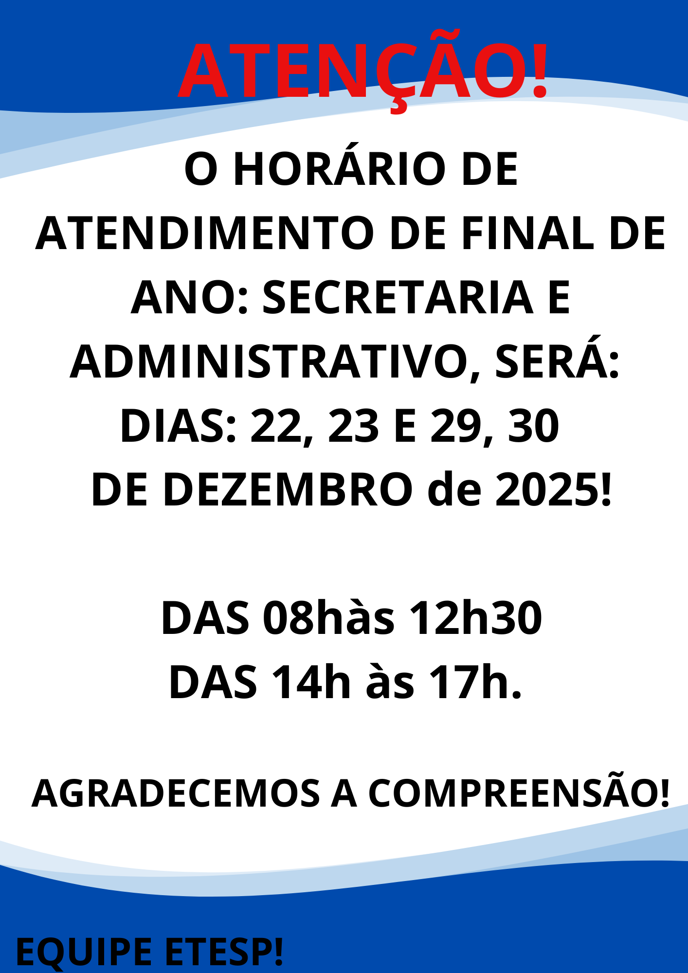 Nos dias 22, 23, 29 e 30 de dezembro o atendimento do Administrativo e da Secretaria serão das 08h às 12h30, e das 14h às 17h.