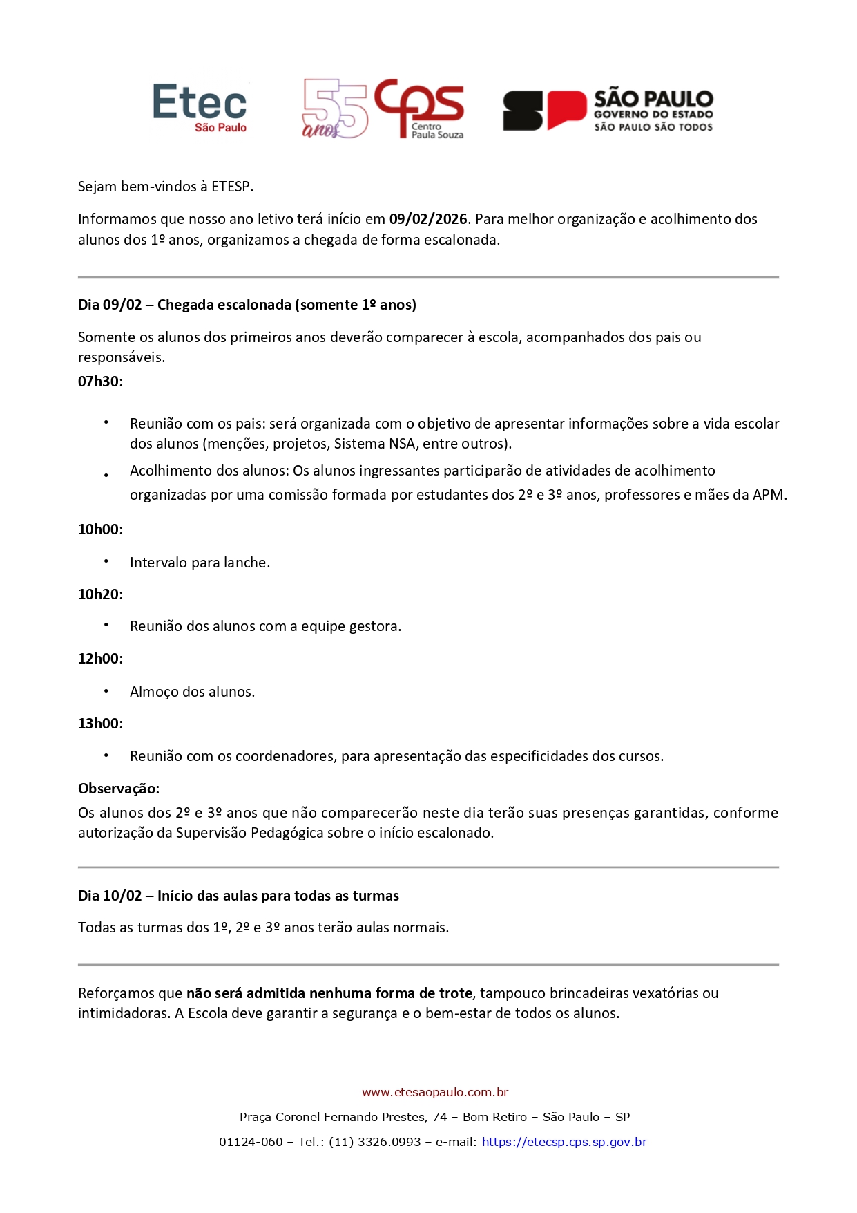 Reforçamos que não será admitida nenhuma forma de trote, tampouco brincadeiras vexatórias ou intimidadoras. A Escola deve garantir a segurança e o bem-estar de todos os alunos.