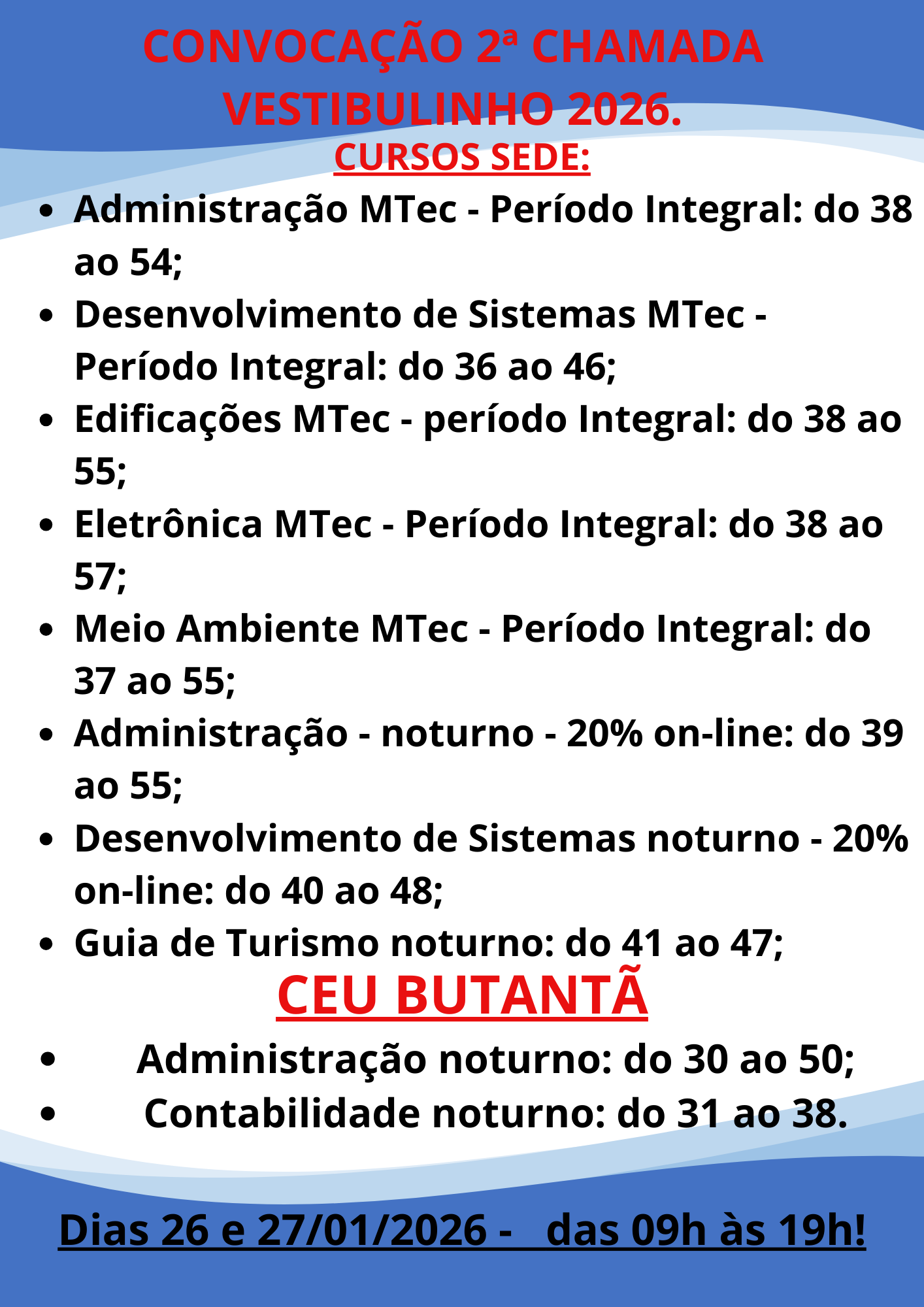 CURSOS SEDE: CURSOS CEU BUTANTÃ Dias: 19 e 20/01/2026 – das 09h às 19h! Prepare sua documentção, e não perca as datas e horários. Lembramos a todos que temos vagas de ampla concorrência. #Etespvêm!!