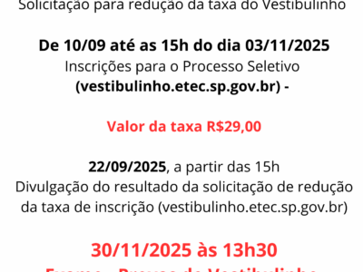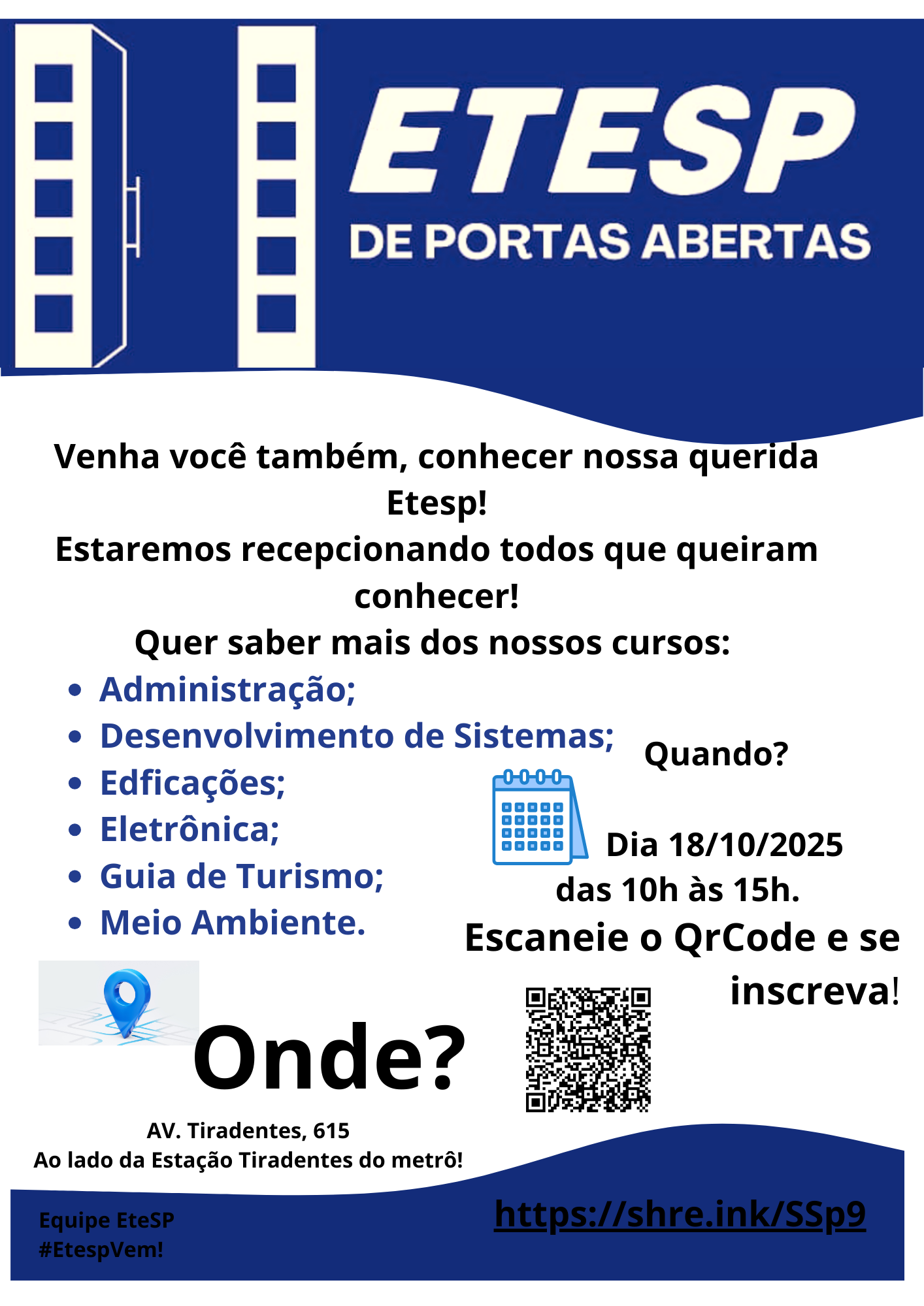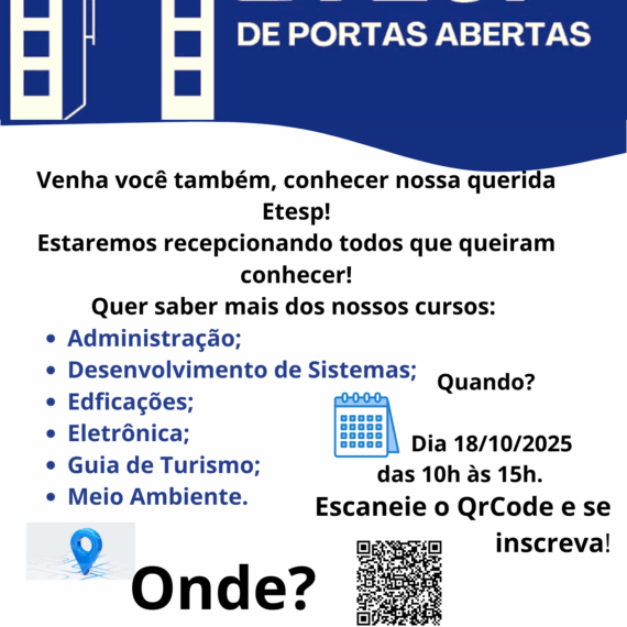 Está chegando a data! Fique de olho no calendário, preencha o forms para o melhor horário de sua visita, e venha conhecer a ETESP. Conheça nossos cursos e as dependências da ETESP. #EtespVem Av. Tiradente, […]