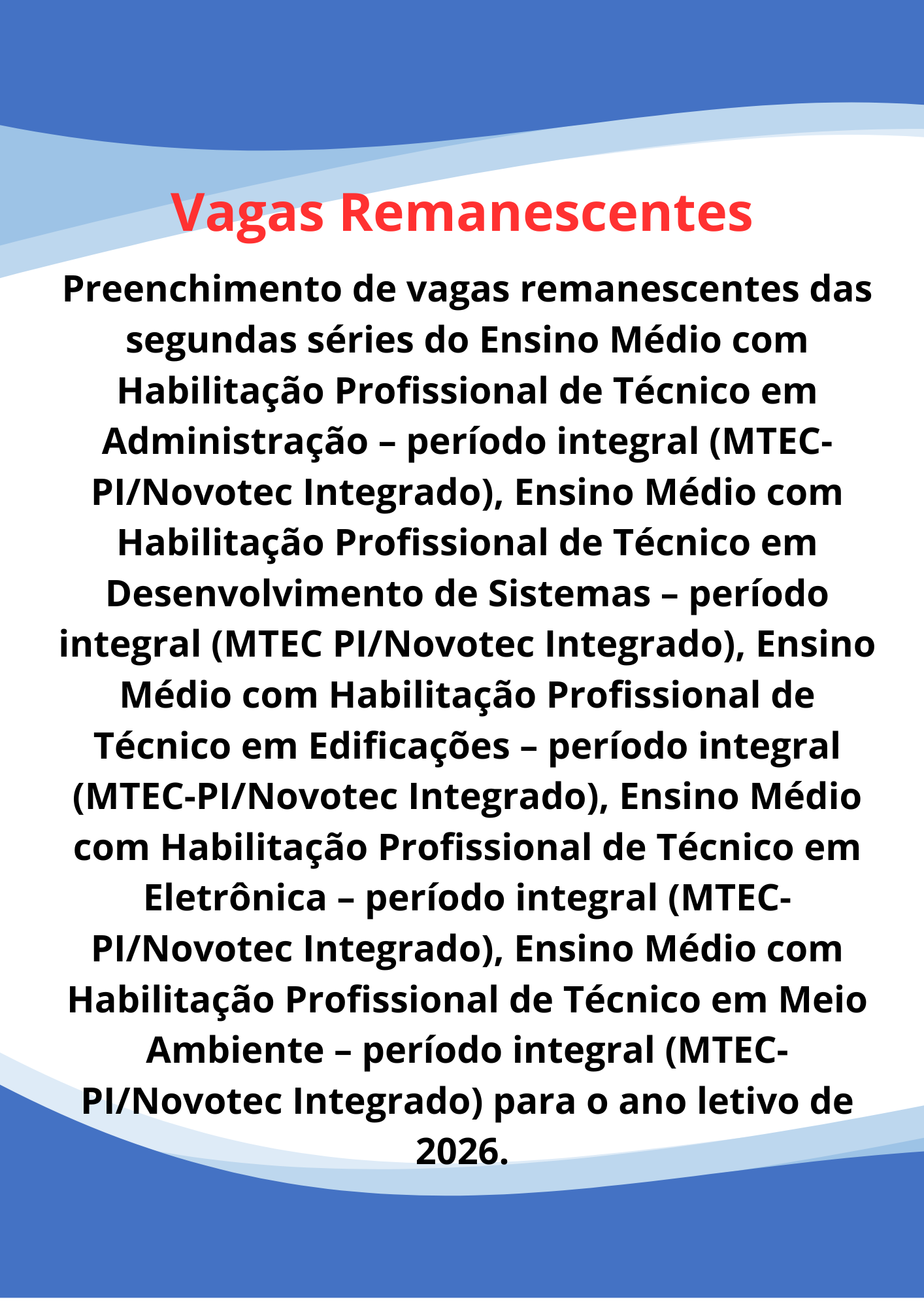 Saiu o edital para vagas remanescentes!Preenchimento de vagas remanescentes das segundas séries do Ensino Médio com Habilitação Profissionalde Técnico em Administração – período integral (MTEC-PI/Novotec Integrado), Ensino Médio comHabilitação Profissional de Técnico em Desenvolvimento de […]